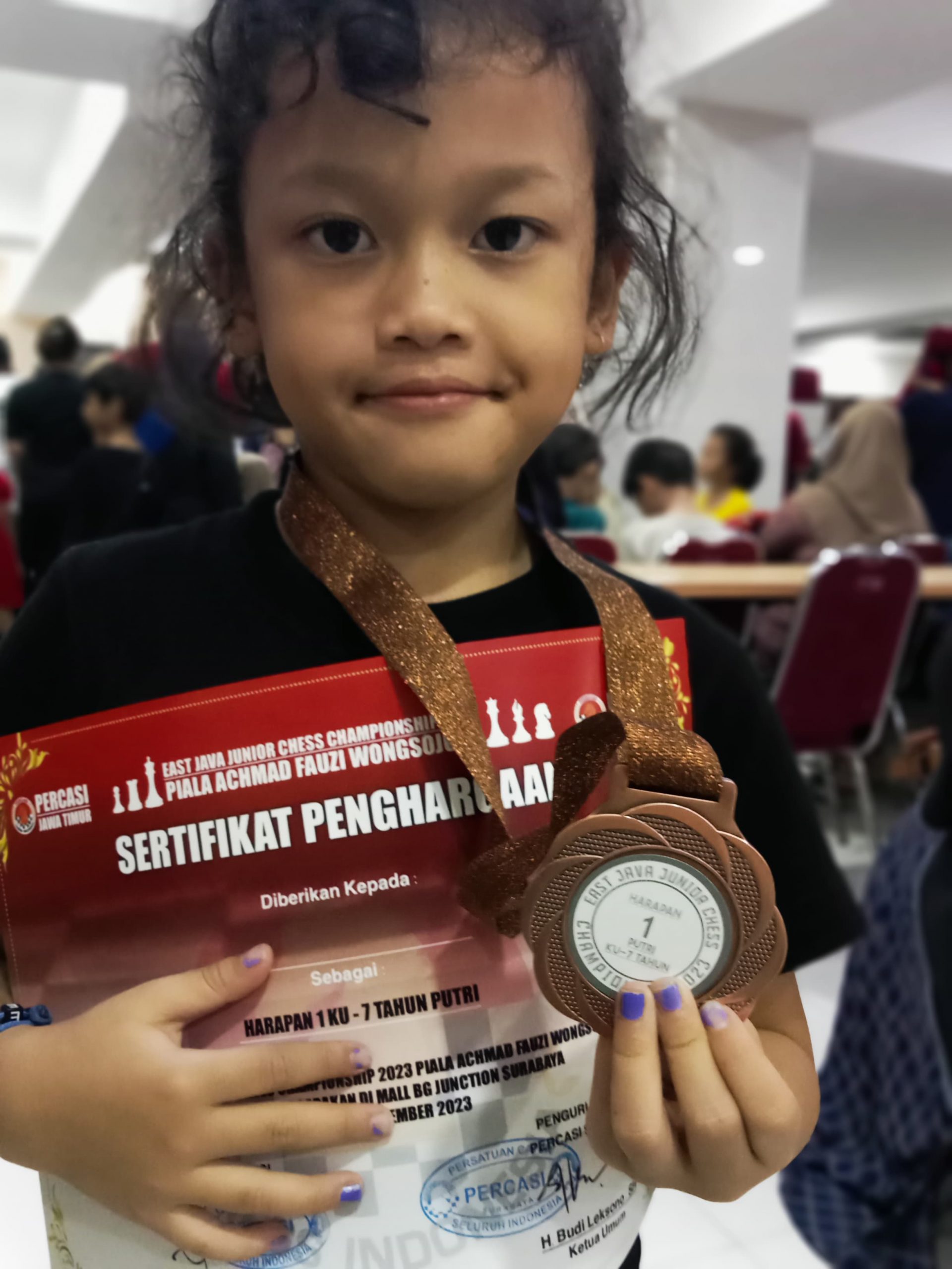 Malang,BeritaAntara.Com- Pecatur Putri Calretta Meisie Santiano Ketegori Kelompok usia 7 tahun Putri Kelas I MINU Jatirejoyoso,Kepanjen Kabupaten Malang berhasil meraih Juara Harapan I pada Turnamen Catur EAST JAVA JUNIOR CHAMPIONSHIP 2023 tingkat Provinsi Jawa Timur yang diselenggarakan oleh Percasi kota Surabaya Percasi Jawa Timur dan Koni Surabaya, Yang diikuti oleh ratusan peserta dari berbagai penjuru kota di jawa timur terdiri dari kelompok Usia (KU 6 tahun sampai KU 16 tahun) dari berbagai Kota dan perguruan catur yang berada di Jawa timur pada Minggu pagi (23/12/2023).