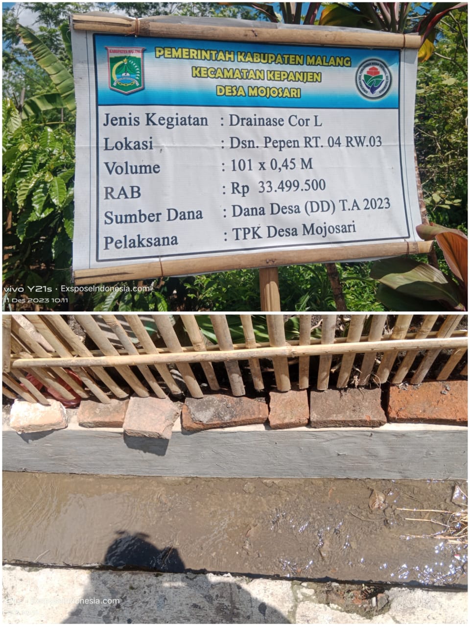 Malang- BeritaAntara.com – Pekerjaan proyek drainase yang menggunakan Cor L dengan menggunakan sumber dana dari Dana Desa (DD ) sebesar Rp. 33.499.500 di jalan terkesan dibiarkan asal jadi. Proyek tersebut terletak di dusun Pepen RT/RW 04/03 Desa mojosari kecamatan Kepanjen kabupaten Malang.