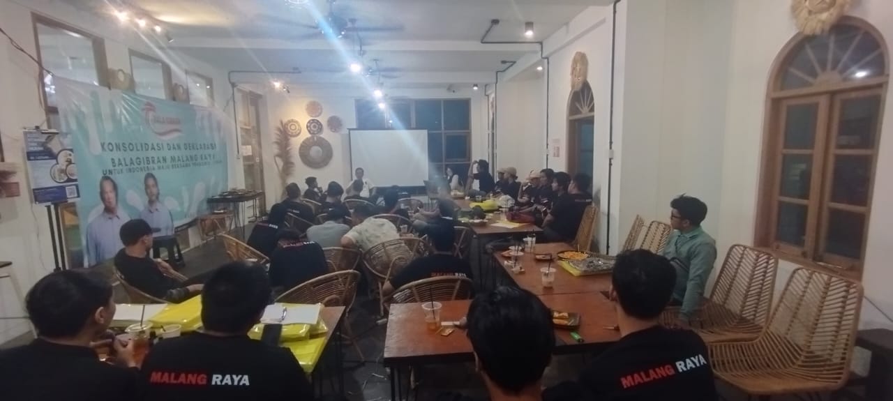 Deklarasi dukungan untuk Indonesia Maju Bersama Prabowo-Gibran digelar Bala Gibran Malang Raya pada Rabu malam (13/12). Deklarasi itu dihadiri para koordinator kabupaten/kota hingga struktur tingkat kecamatan. Para relawan itu tumbuh secara organik dari berbagai latar belakang.