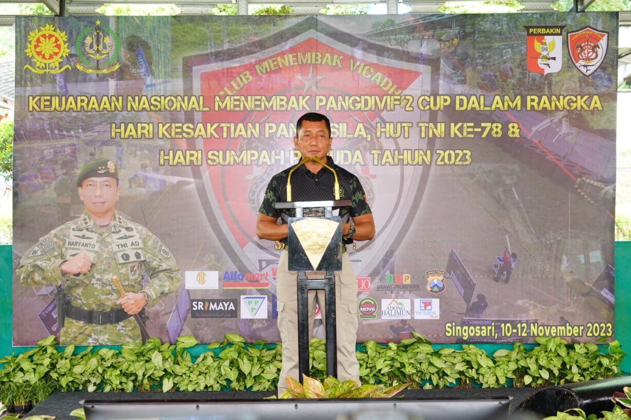 Dalam sambutannya, Pangdivif 2 Kostrad Mayjen TNI Haryanto, S.I.P., M.Tr. (Han)., menyampaikan, “Olahraga menembak merupakan olahraga untuk menguji kemahiran (akurasi dan kecepatan) petembak dengan berbagai macam kategori yang dapat dipertandingkan. Olahraga ini tentunya melibatkan berbagai pihak seperti Perbakin yang mewadahi, menaungi, membimbing, mengkoordinir dan mengawasi perkumpulan serta organisasi bidang menembak di seluruh Indonesia” tuturnya.