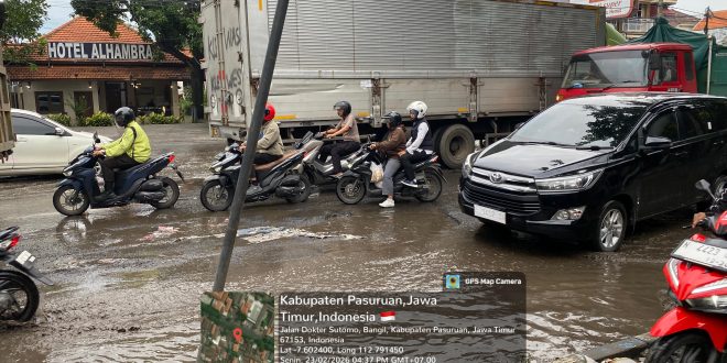 - Pasuruan – Kondisi memprihatinkan terlihat di ruas jalan nasional Surabaya–Probolinggo, tepatnya di wilayah Kabupaten Pasuruan, tak jauh dari Mapolres Pasuruan. Jalan yang menjadi urat nadi transportasi utama antar kota itu kini dipenuhi lubang dan kerap tergenang air saat hujan turun. Dalam pantuan awak media senin tanggal 23 feb 2026